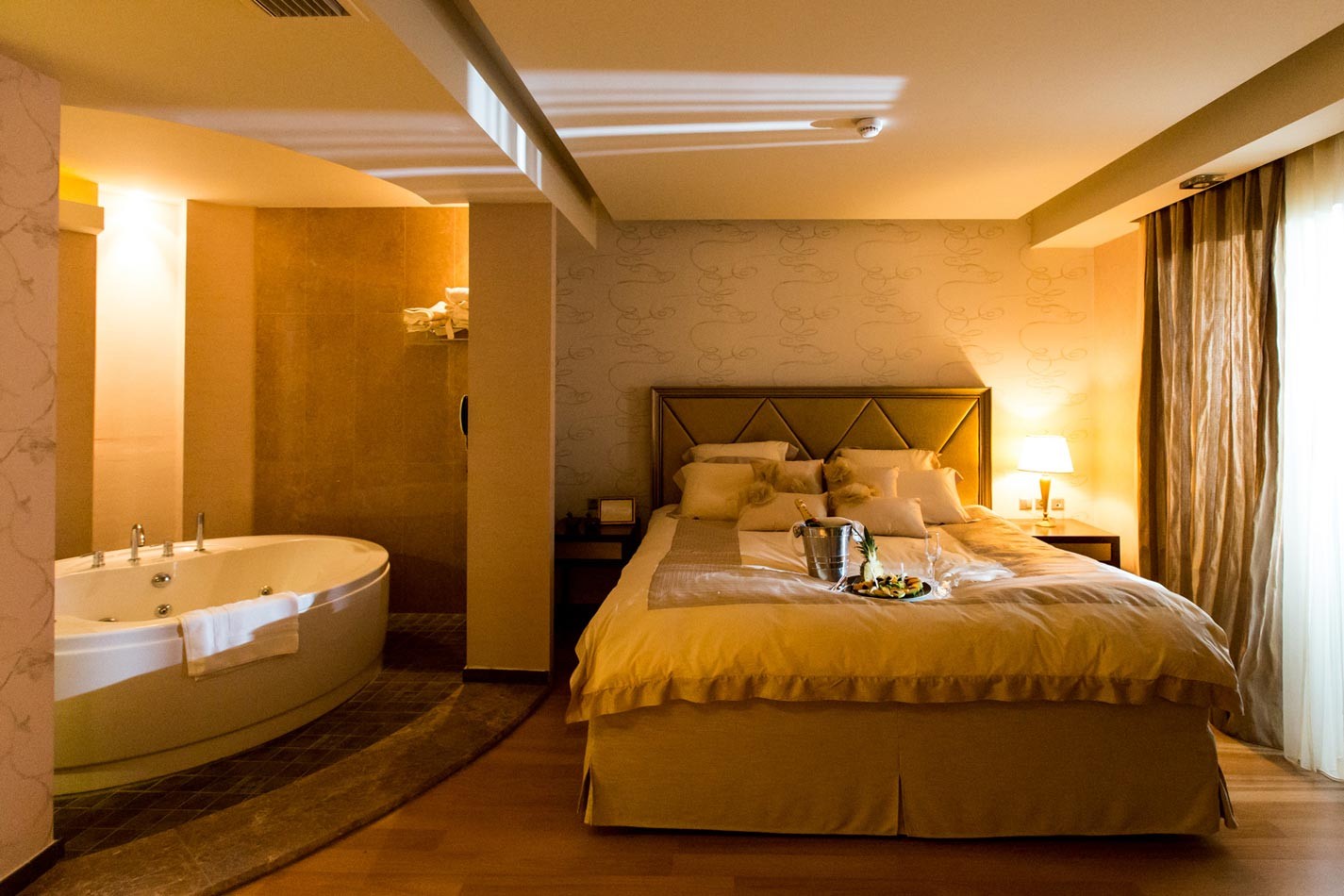 The Wedding Suite of Elpida Resort & Spa is a dream characterized by luxury and romanticism. The big, bright bedroom with the king-size bed, the jacuzzi next to it, the special furniture in calm, beige and golden tones and the special fabrics create a wonderful atmosphere of romanticism, calmness and relaxation for the newly weds.